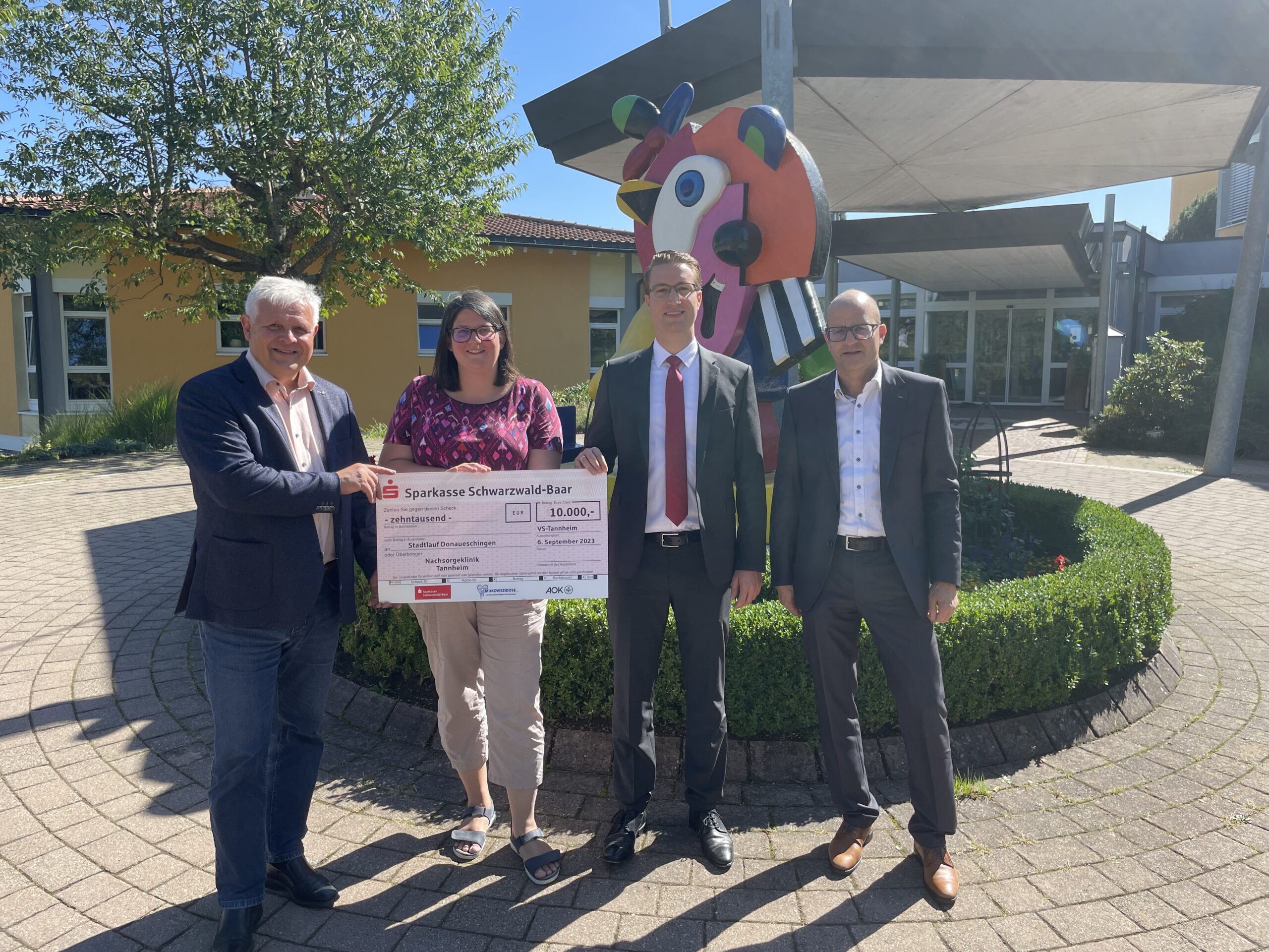 Große Freude bei bestem Wetter in der Nachsorgeklinik Tannheim. Denn erneut durfte Geschäftsführer Thomas Müller einen Spendenscheck in Höhe von 10.000 Euro aus dem Schutzengellauf durch die Donaueschinger Innenstadt entgegennehmen.
